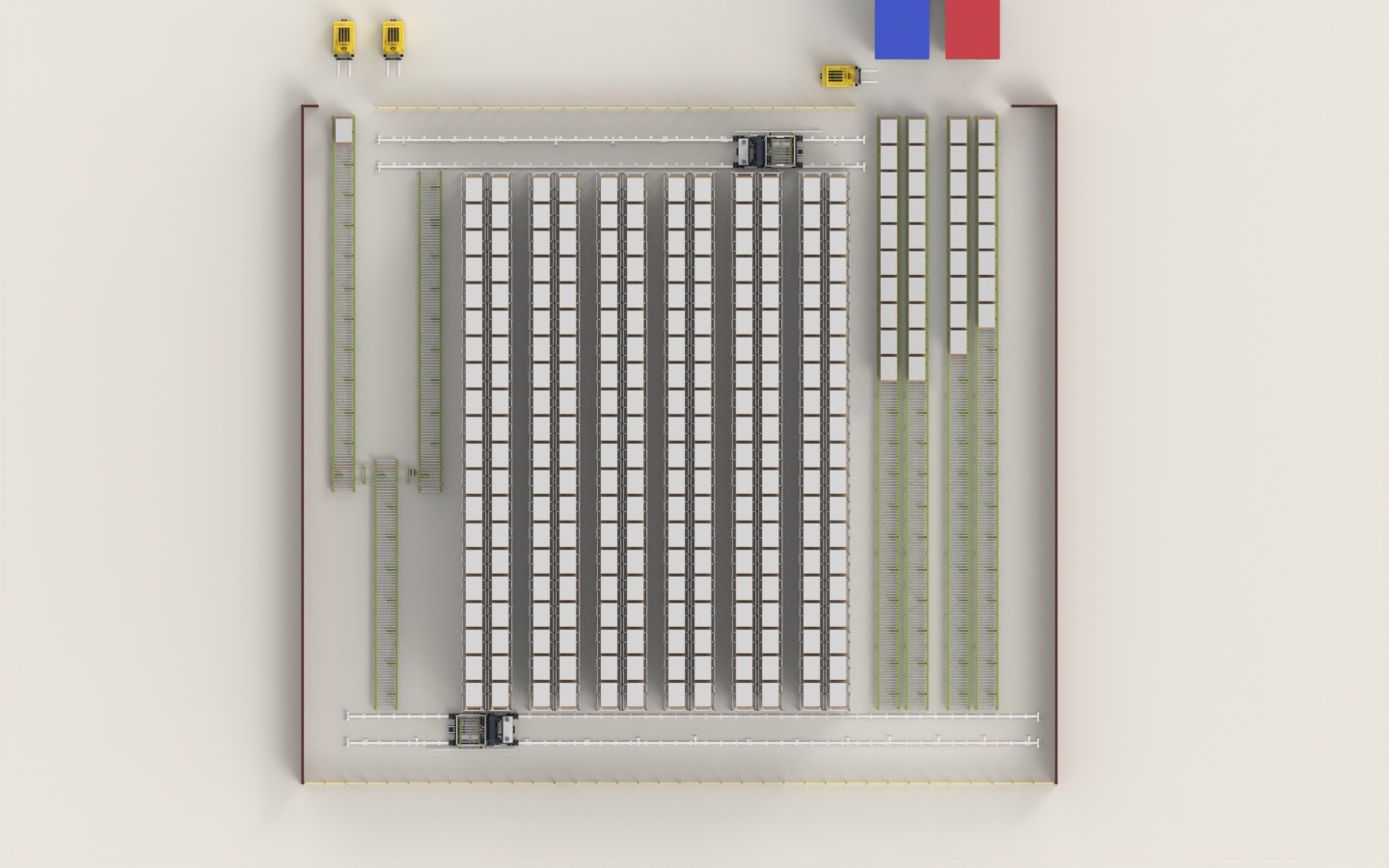 For a gravity roller conveyor flow channel warehouse in the beverage industry, a high-performance transfer car was implemented. The infeed and outfeed of pallets are handled by separate transfer cars. This clear division of tasks ensures a continuous material flow.