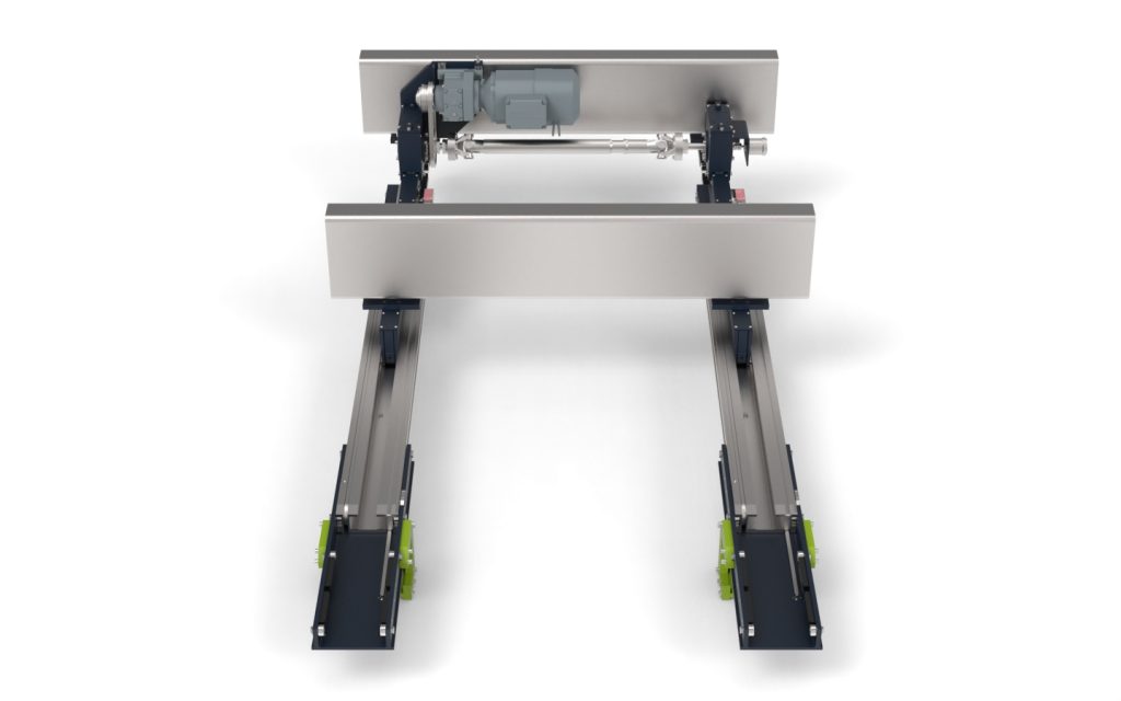 Hanging telescopic fork that is used for transporting and storing rolls of prematerial in the tire manufacture industry.