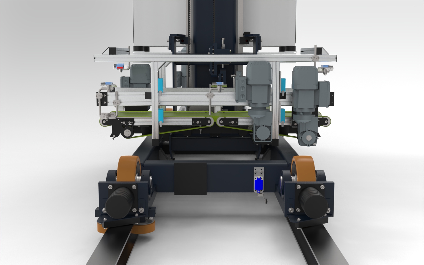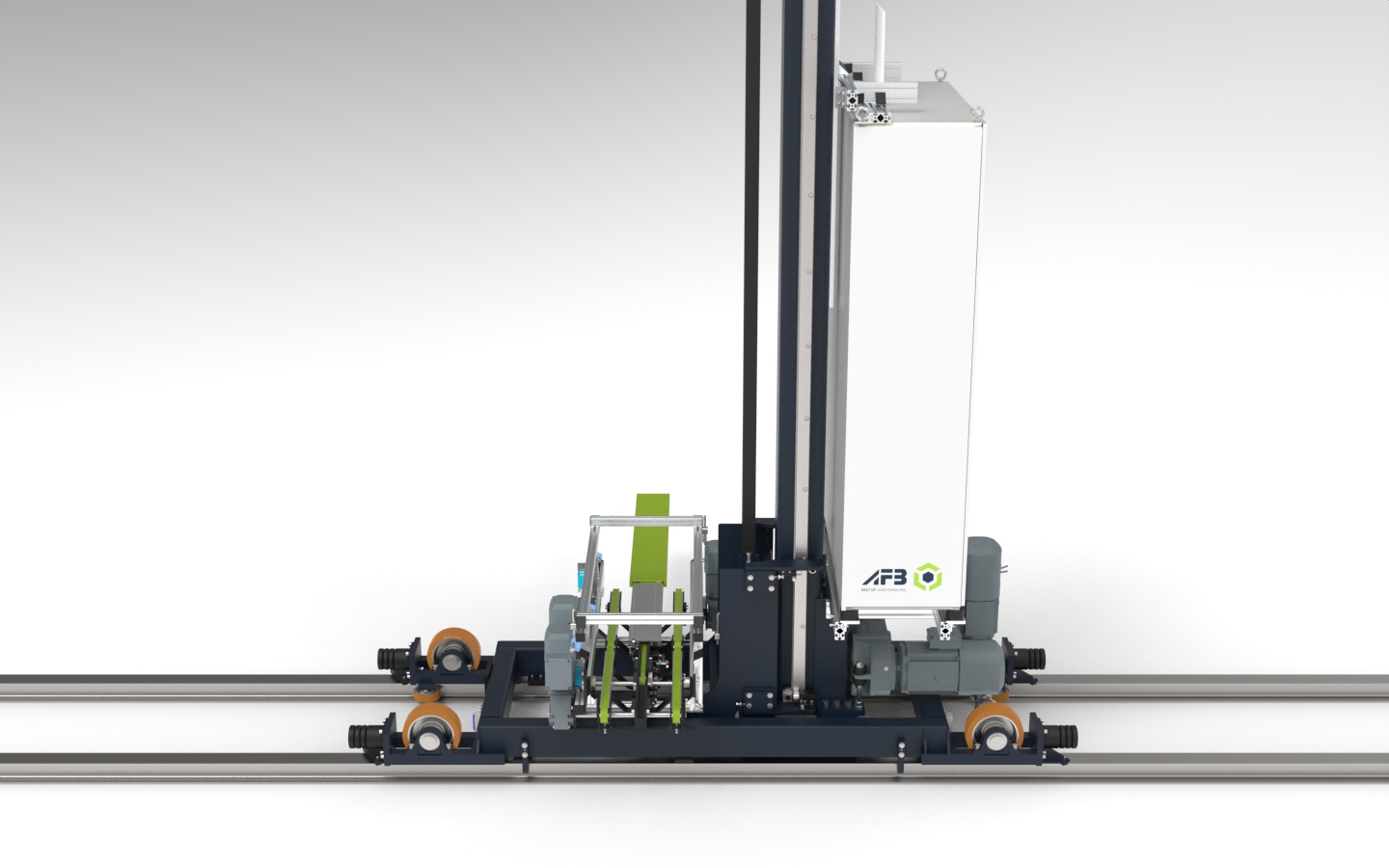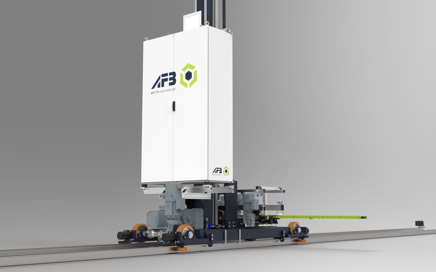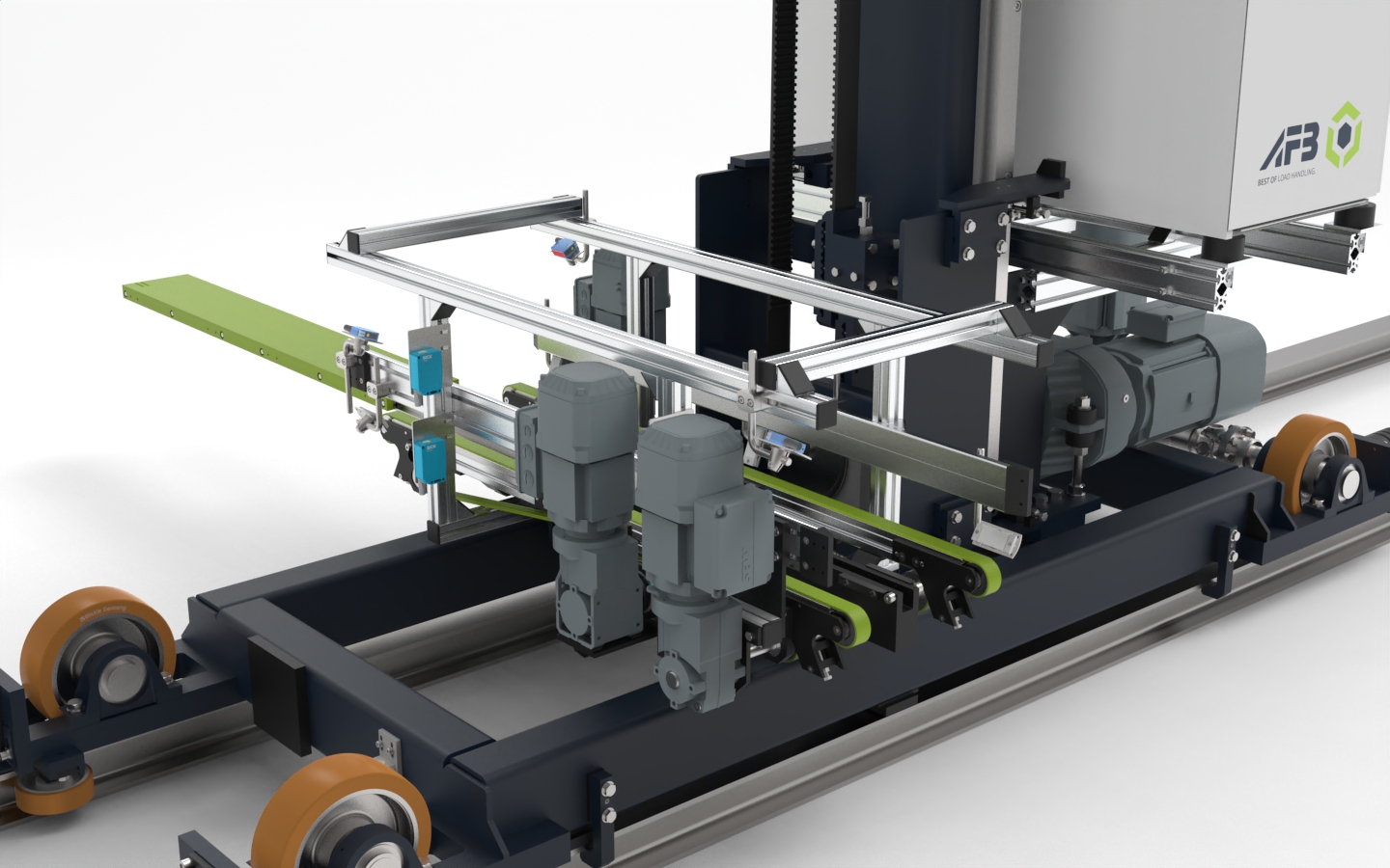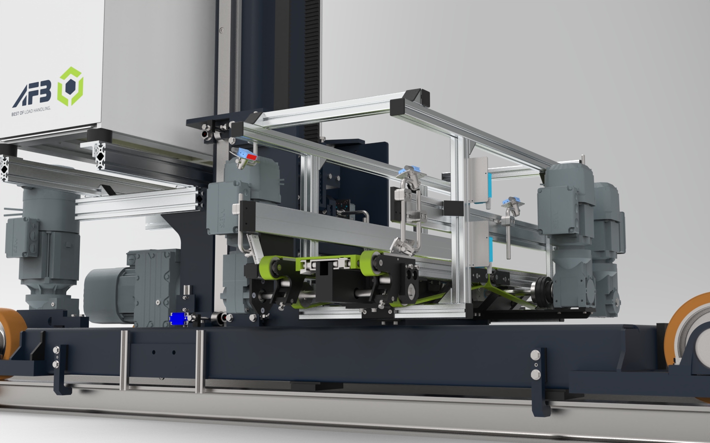 Der Riemenantrieb des Teleskoptischs bringt den Vorteil mit sich, dass er besonders hohe Beschleunigungs- und Geschwindigkeitswerte schafft. Gleichzeitig ist das System verschleißarm und wartungsfreundlich. Auch der Hubantrieb funktioniert mit Riemen, die eine lange Lebensdauer und die präzise Positionierung des Hubrahmens garantieren. Die Konstruktion mit Einholm-System reduziert zudem das Gewicht des Verfahrwagens.
