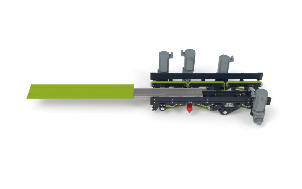 Das Lastaufnahmemittel erlaubt wahlweise die gleichzeitige Aufnahme von drei Behältern oder die sequenzielle Kommissionierung innerhalb derselben Regalgasse. Drei integrierte Riemenförderer übernehmen dabei die Übergabe der Behälter vom Regalbediengerät auf die nachgelagerte Fördertechnik, etwa in Richtung Kommissionierung, oder übernehmen die Behälter von der Fördertechnik. Wird die Dreifachaufnahme nicht vollständig genutzt, können die Behälter in der Gasse sequenziell aufgenommen und kommissioniert werden – ein nahtloser Materialfluss ohne zusätzliche Schnittstellen.