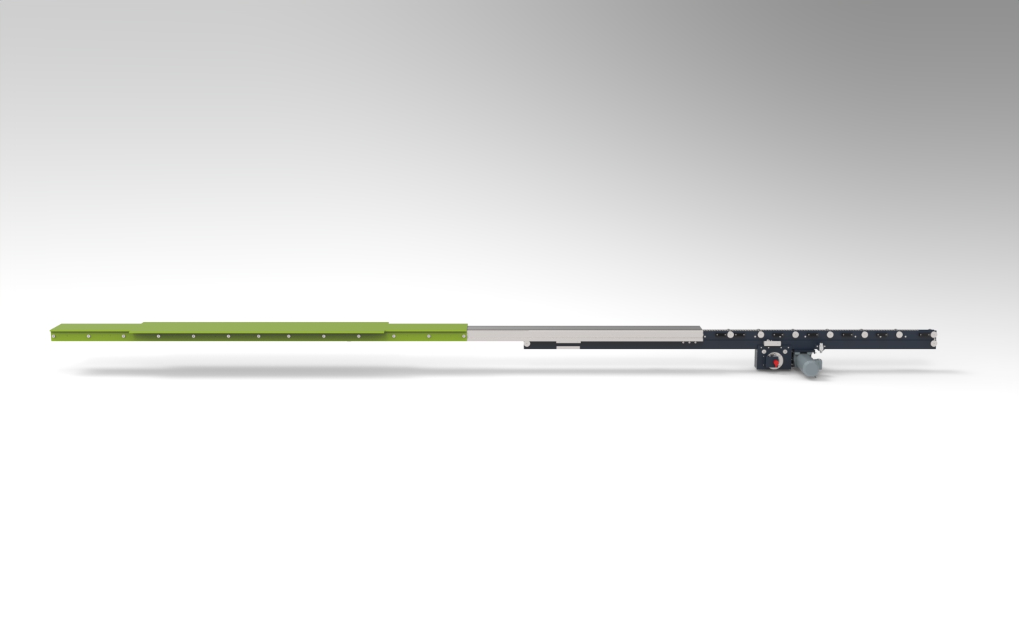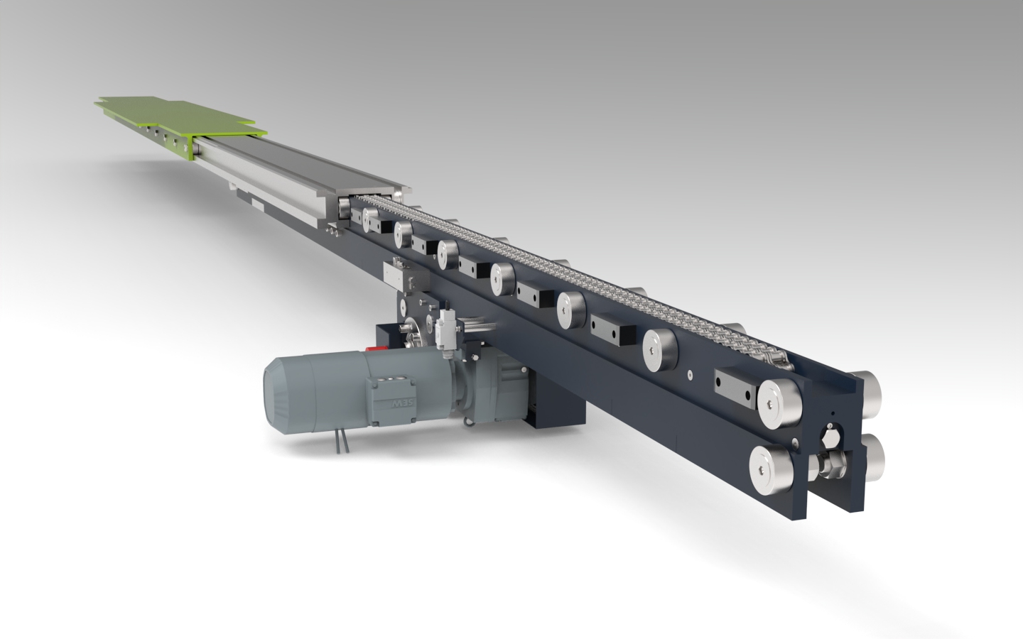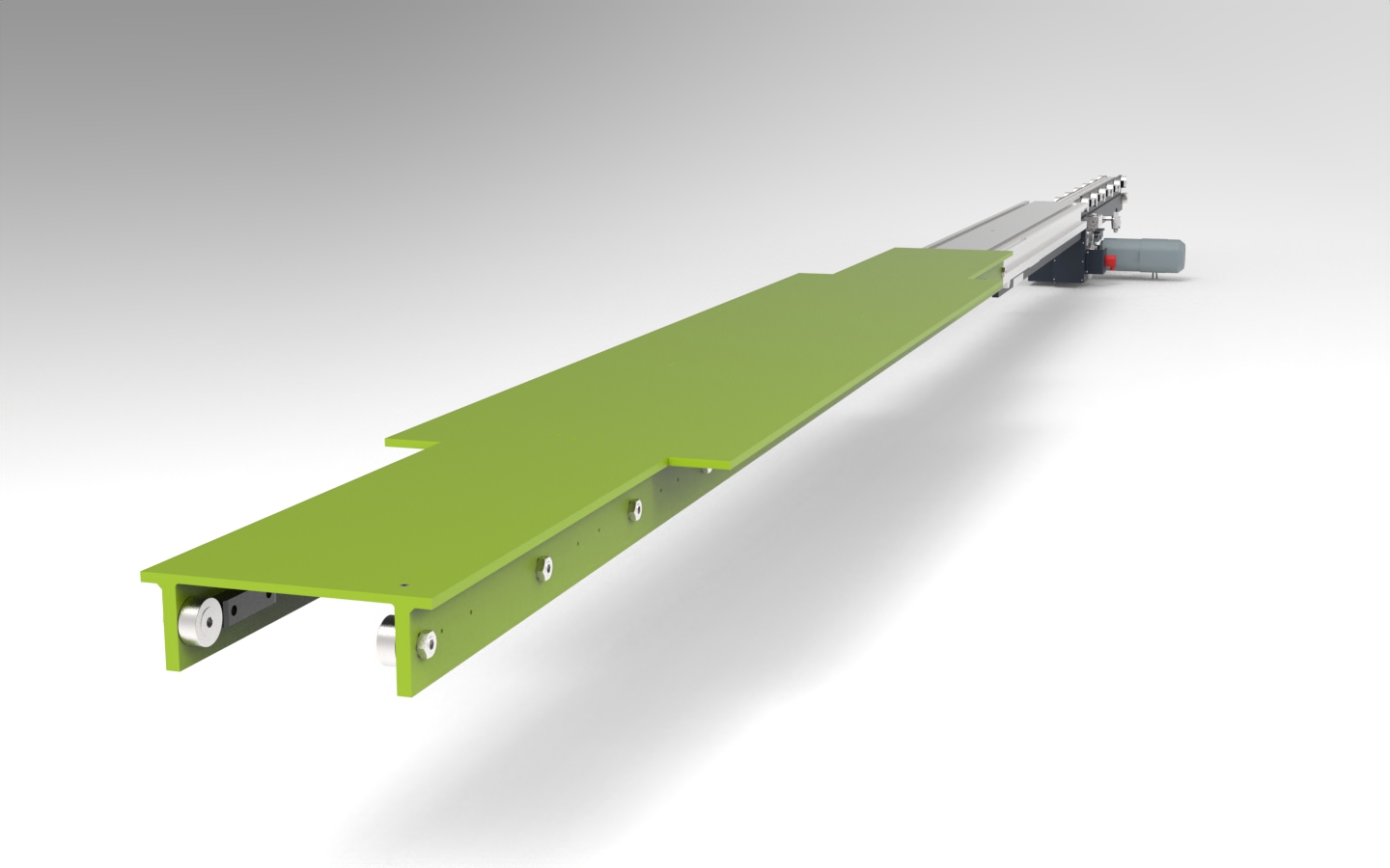 Für die Produktionslinie eines deutschen Premium Automobilherstellers entwickelt, erfüllt der Teleskoptisch Typ 150-420-5100 höchste Ansprüche an Zuverlässigkeit. Speziell konzipiert für die Einlagerung lackierter Karosserien, ist dieses System auf einem Regalbediengerät (RBG) installiert und bewältigt Lasten bis zu 1.000 kg. Die Sonderkonstruktion berücksichtigt die speziellen Anforderungen des Kunden, wobei eine Gerätelänge von 5100 mm und eine ausfahrende Höhe von 150 mm über die Profile P1 und P2 eine optimale Lastaufnahme gewährleisten.