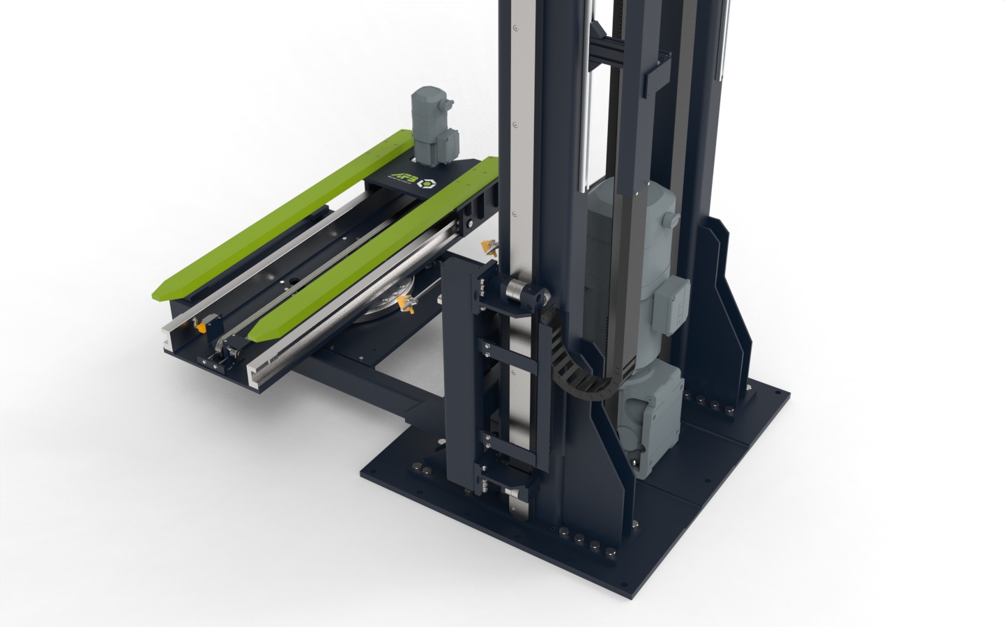Für ein automatisches Kompaktlagersystem mit moderner Shuttletechnologie wurde von uns ein stationäres Hubmastsystem mit einer Drehschubgabel DSG-0,5-1850 entwickelt. Dieses System ist speziell darauf ausgelegt, Paletten mit einem Gewicht von bis zu 250 kg effizient von einem Rollenförderer zu übernehmen und bodennah bereitzustellen. Um eine besonders niedrige Übergabehöhe zu erreichen, wurde der Hubmast in einer Bodenvertiefung installiert. Ein durchdachtes Detail, das zeigt, wie moderne Technik und praktische Anforderungen perfekt aufeinander abgestimmt sind.