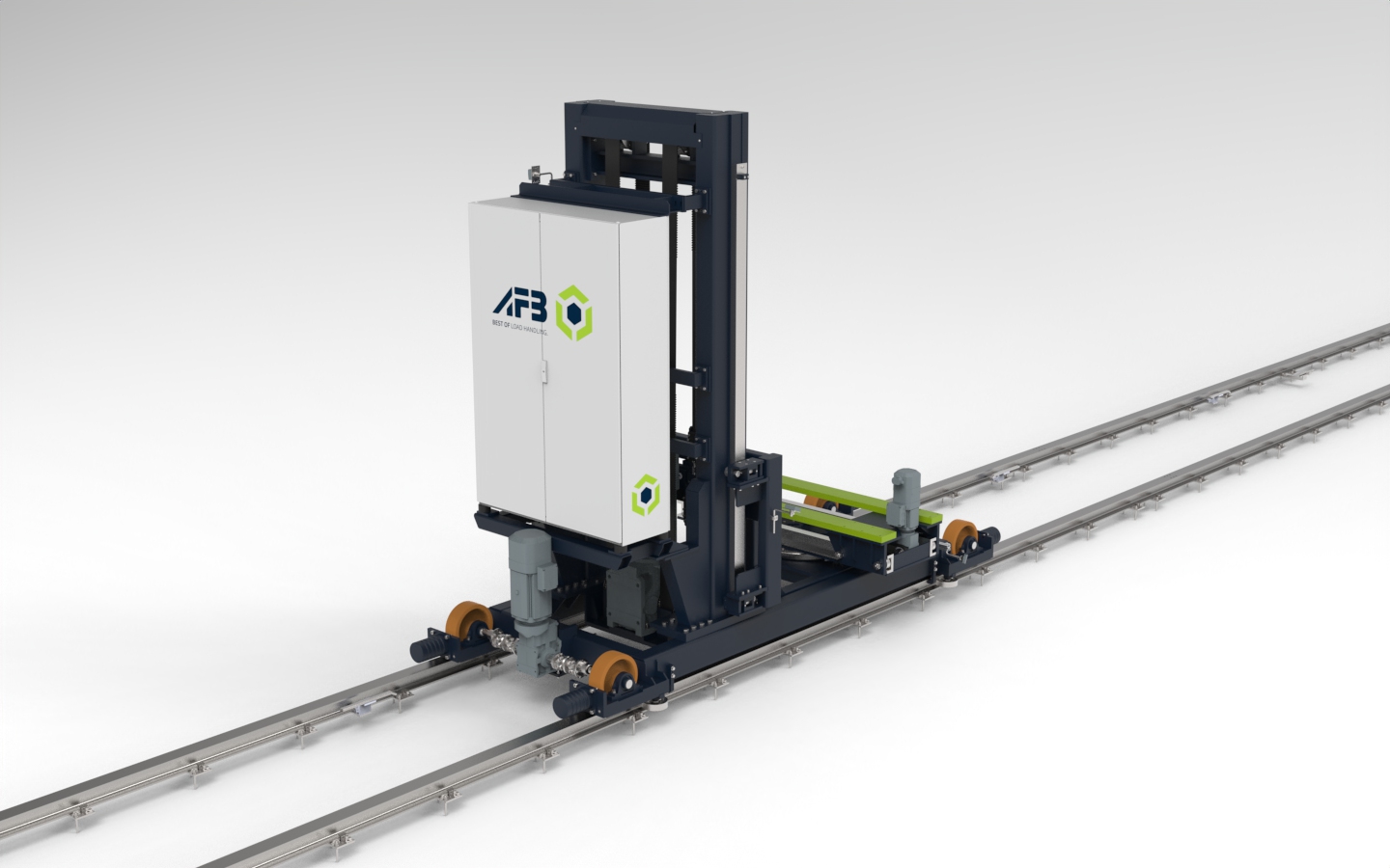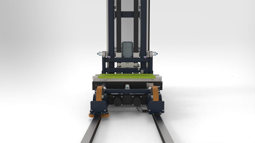 Für ein automatisches Kleinteilelager hat AFB einen speziellen Verfahrwagen mit Hubmast und MINILOAD Teleskoptisch entwickelt, der über zwei Riemenförderer verfügt und präzise Kommissionierfahrten ermöglicht. Das riemenbasierte Antriebssystem sorgt für hohe Dynamik und Wartungsfreundlichkeit, während das Einholm-Design das Gesamtgewicht des Verfahrwagens reduziert und die Konstruktion kompakt hält.