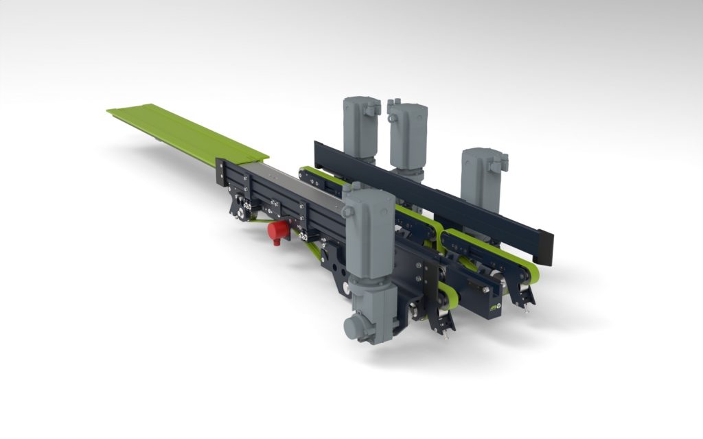 The load handling device enables either simultaneous loading of three containers or sequential picking within the same storage aisle. Three integrated belt conveyors transfer containers from the storage and retrieval machine to the conveyor system below for order picking, for example in the direction of order picking, or take the containers from the conveyor system. If the triple pick-up is not operating at full capacity, containers in the aisle can be picked up sequentially, ensuring a seamless material flow without the need for additional interfaces.