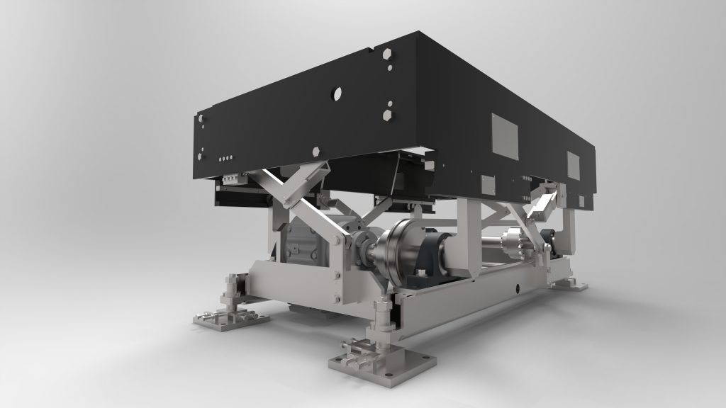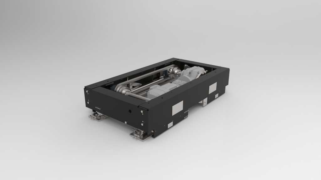 To overcome different heights in a production line, we have developed an eccentric lifting station, which fits perfectly into the customer’s logistics. The task of the eccentric lifting device is to enable a transport of pallets to different conveyor levels and thus ensure an automated production. In combination with the existing conveyor systems, a large number of pallets can be transported reliably and quickly. The special feature of this eccentric lifting station is its very compact design. Despite a low height of only 280 mm, a lifting height of 325 mm is achieved. That way, load carriers can be safely transported from a height of 280 mm to over 600 mm. The innovative design ensures, that the eccentric lifting device always reliably performs its task, even under the greatest stress.